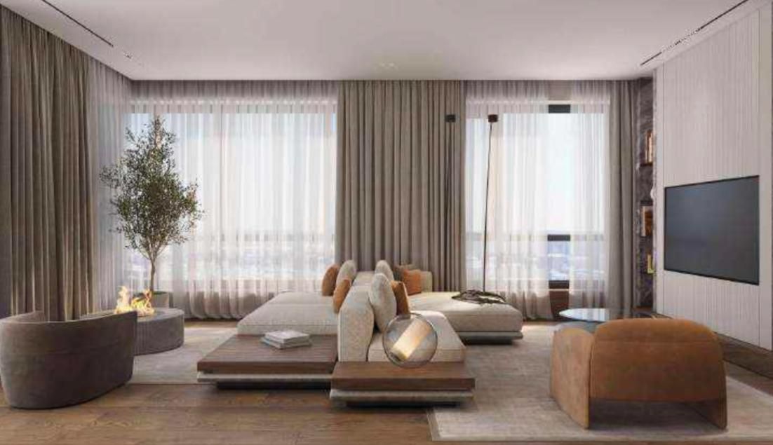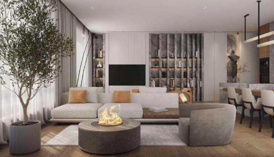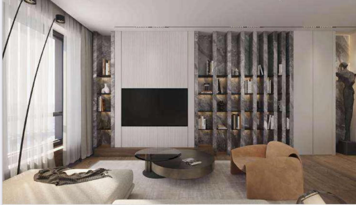В квартире выполнена премиальная дизайнерская отделка с использованием высококачественных и натуральных материалов, таких как: натуральный мрамор, шпон дуба, сатинированная сталь, декоративная штукатурка.