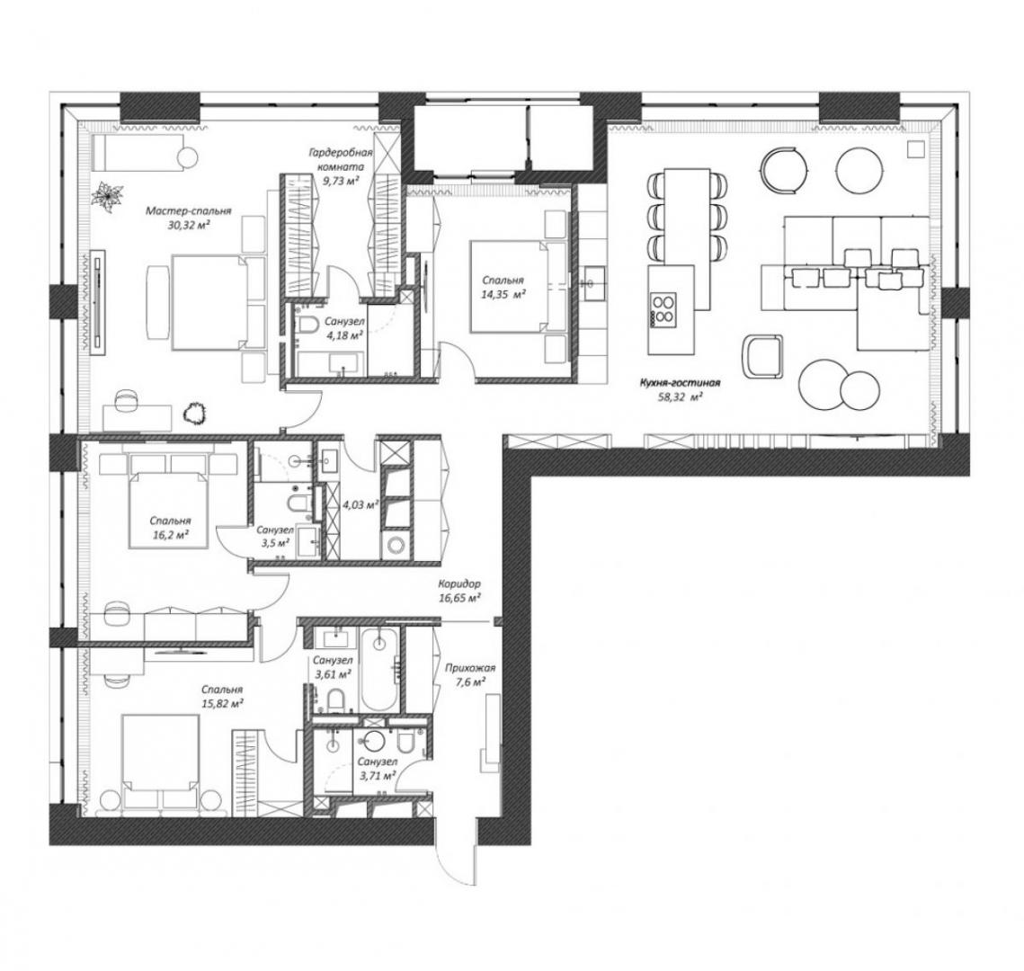 • Кухня гостиная с обеденной зоной (58 кв.м);